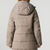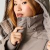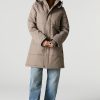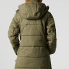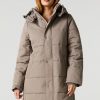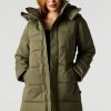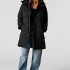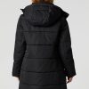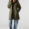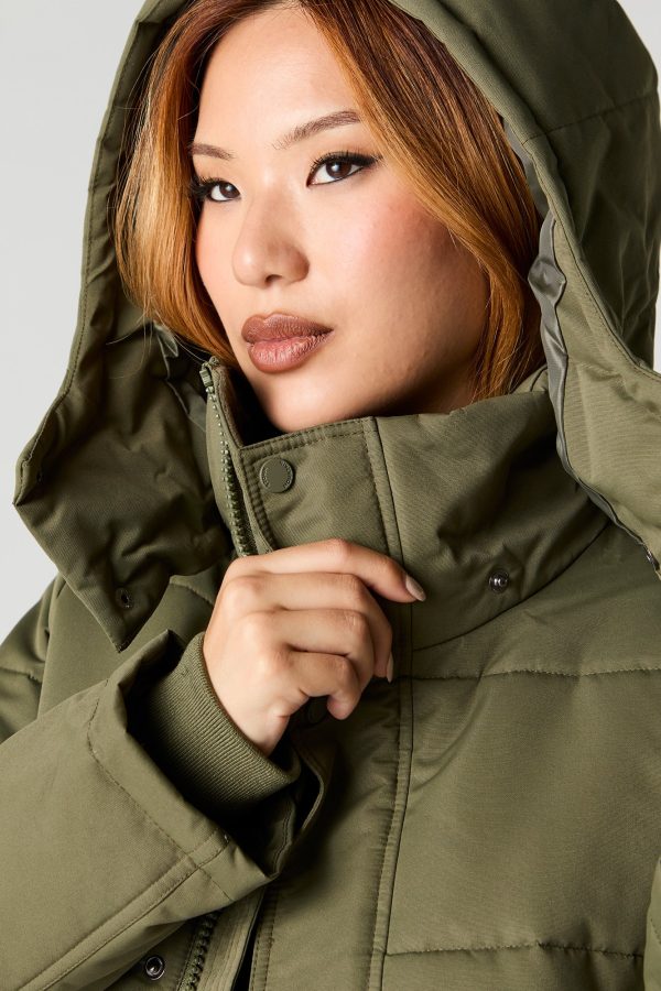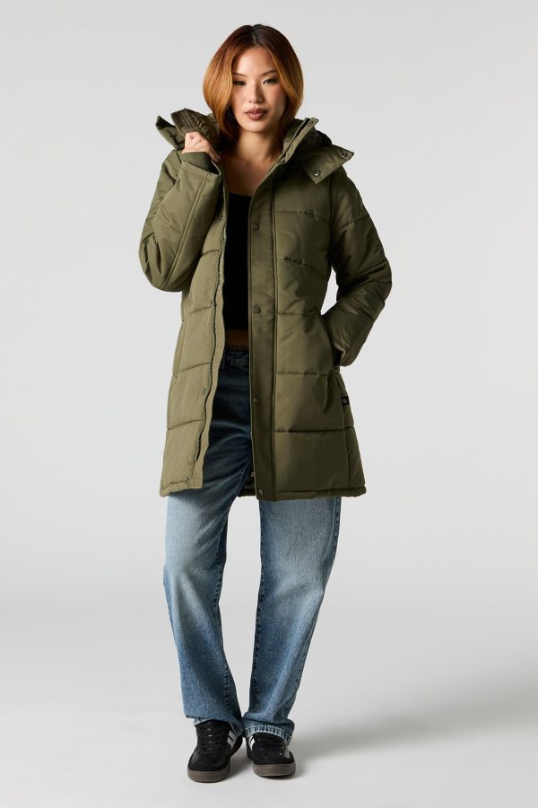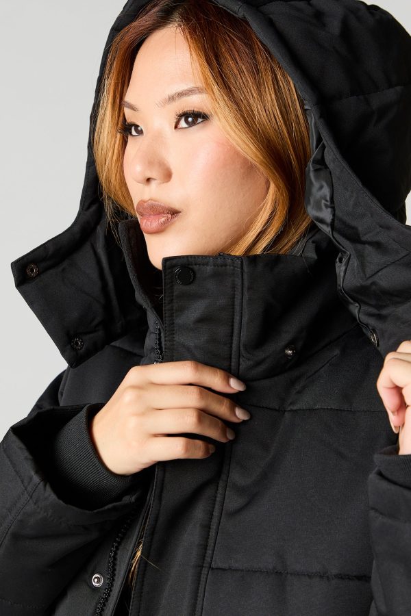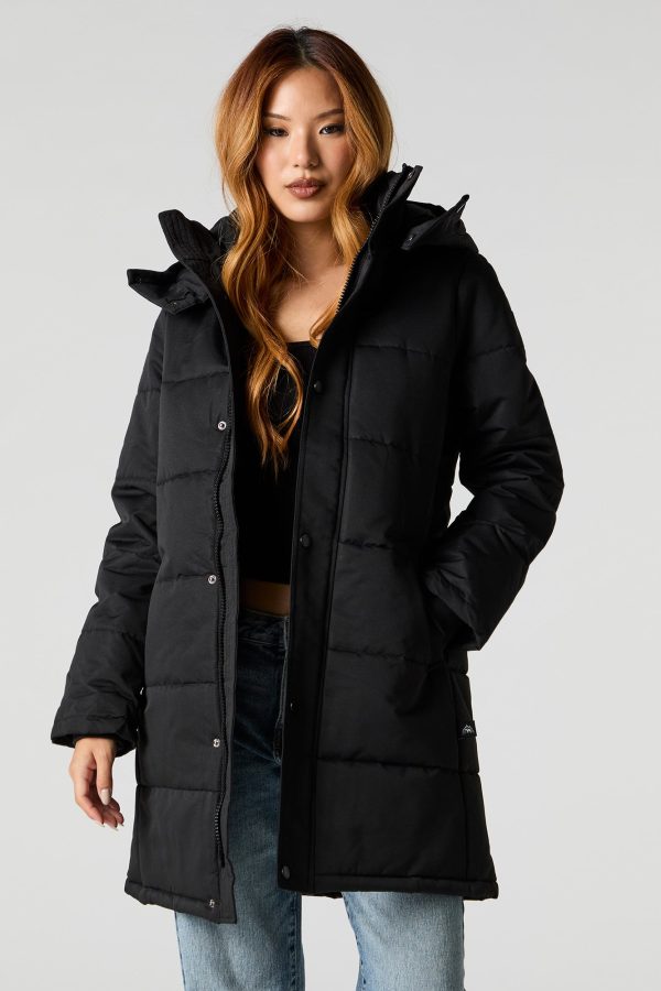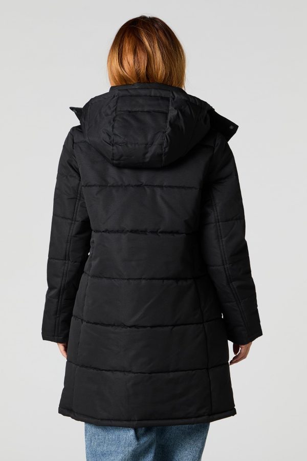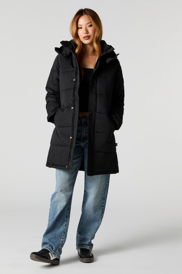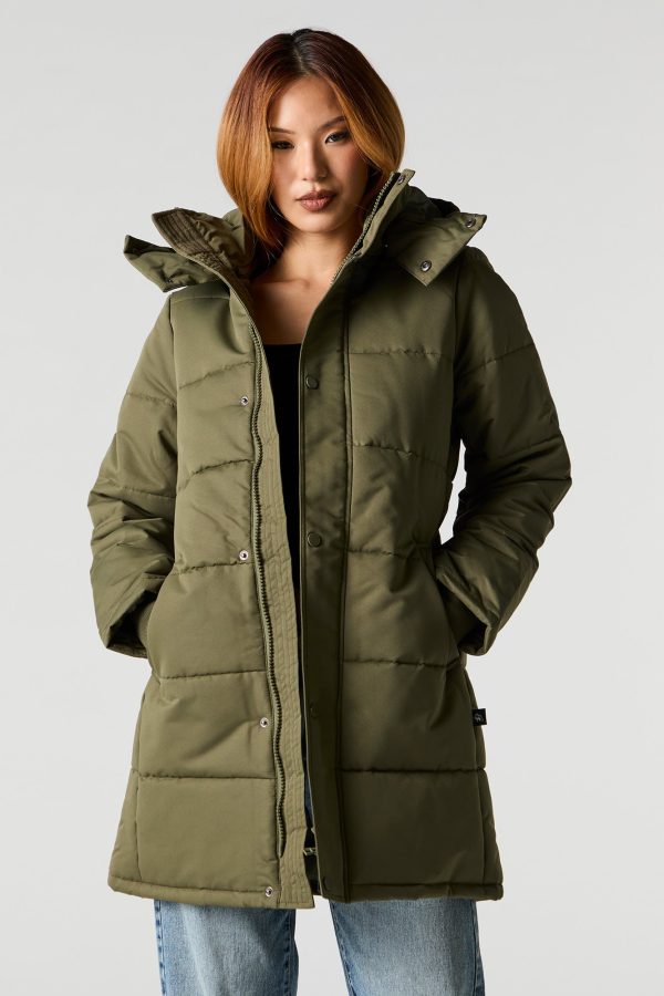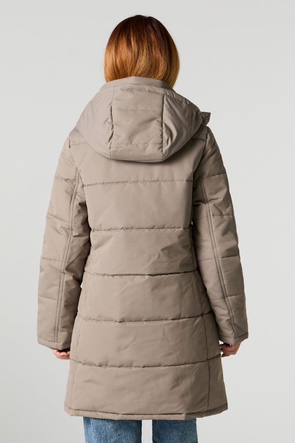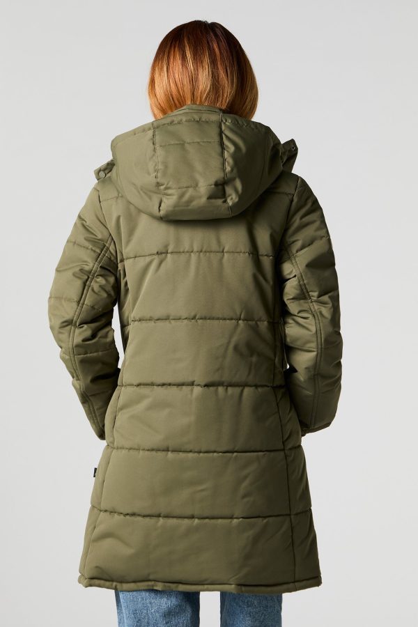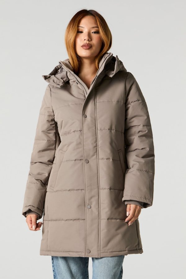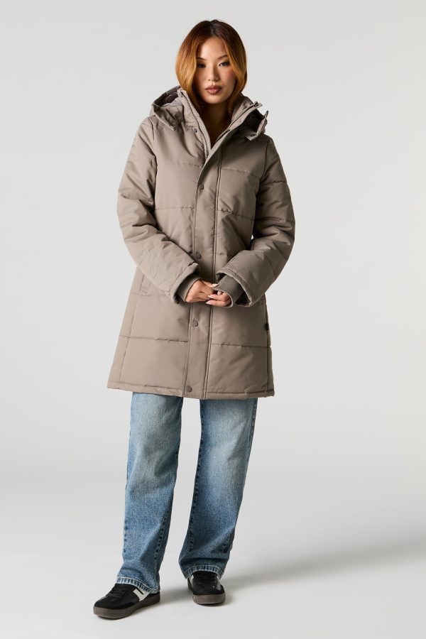 This parka features fully lined quilted material, zip-up snap button front, pockets, removeable snap button hood, long sleeves, and ribbed knit cuffs.