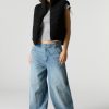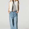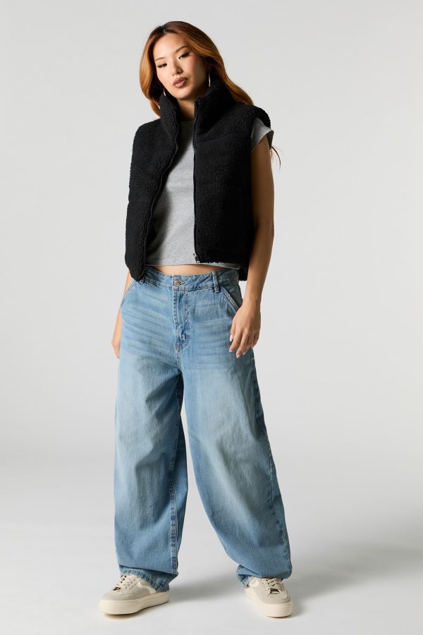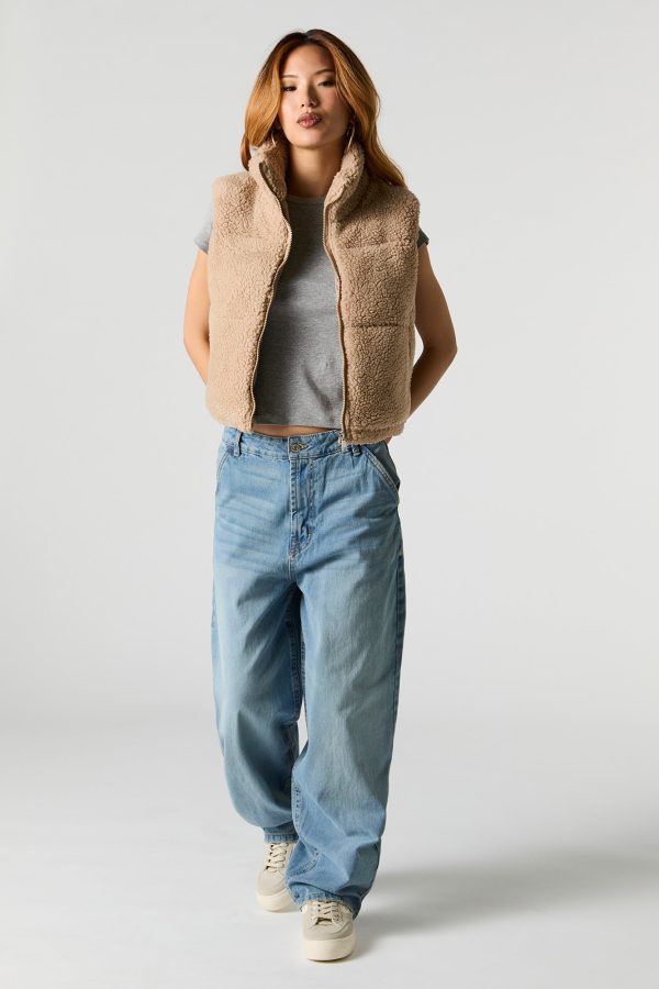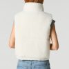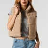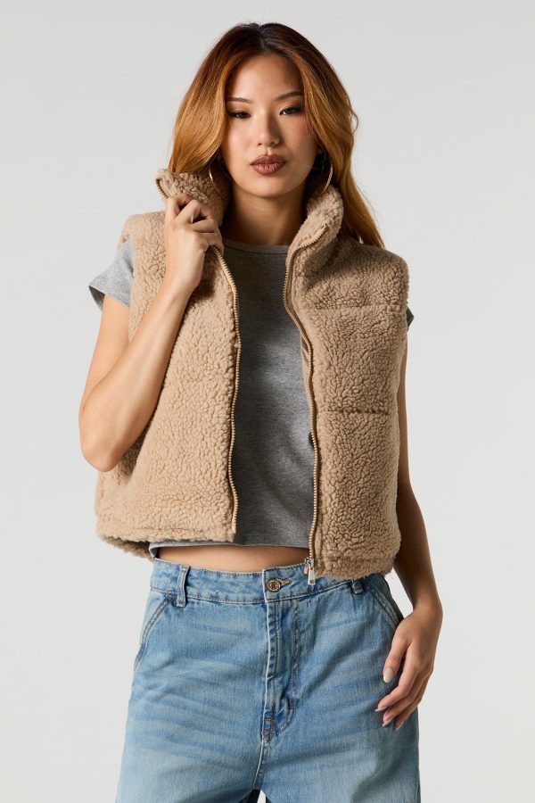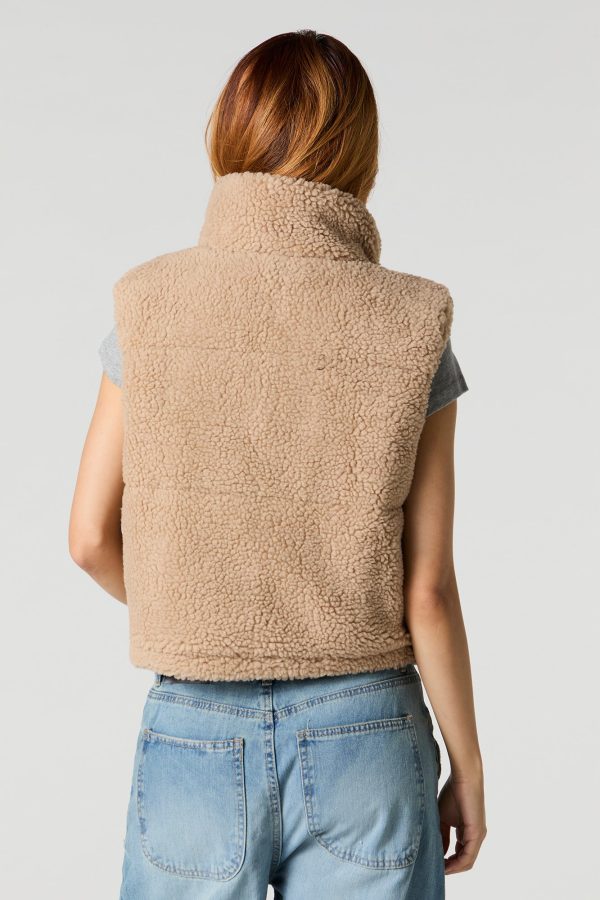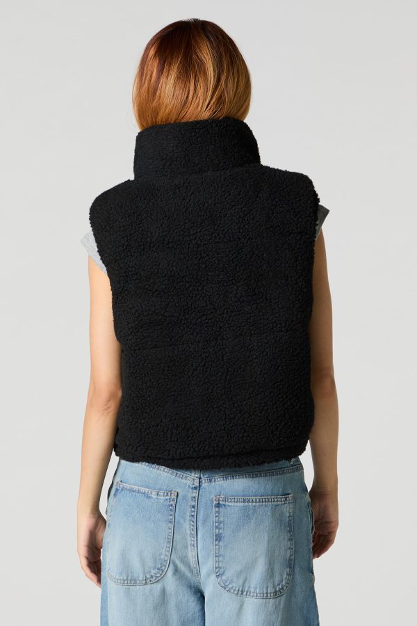 This vest features Sherpa material, puffer construction, mock neck, pockets, and zip-up front.