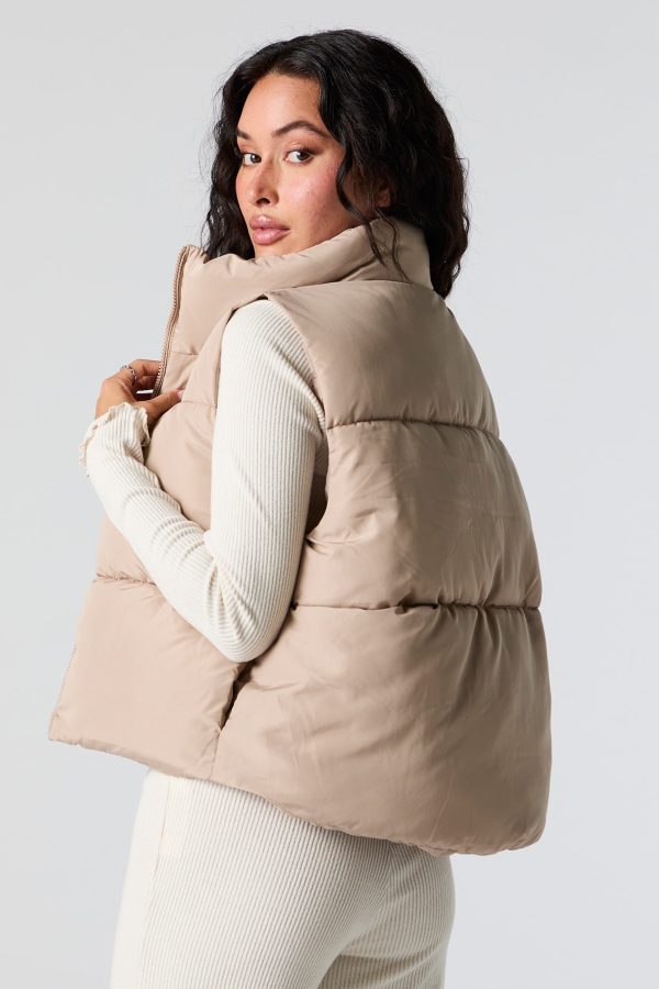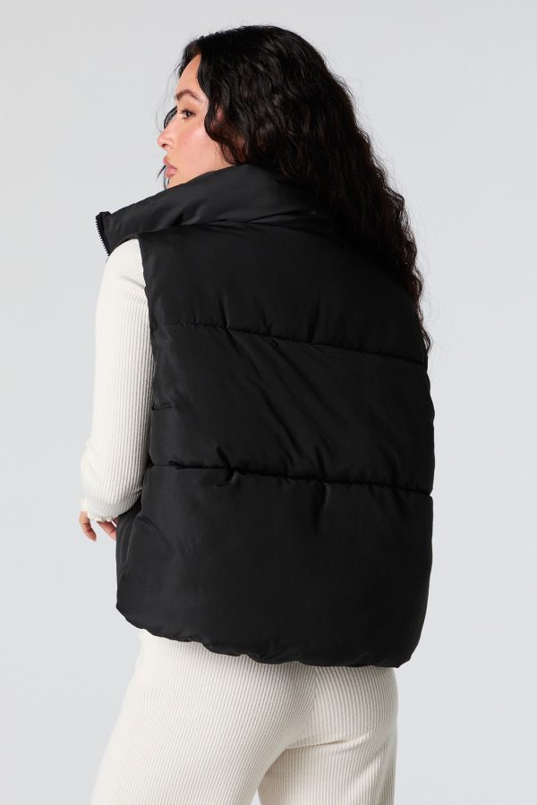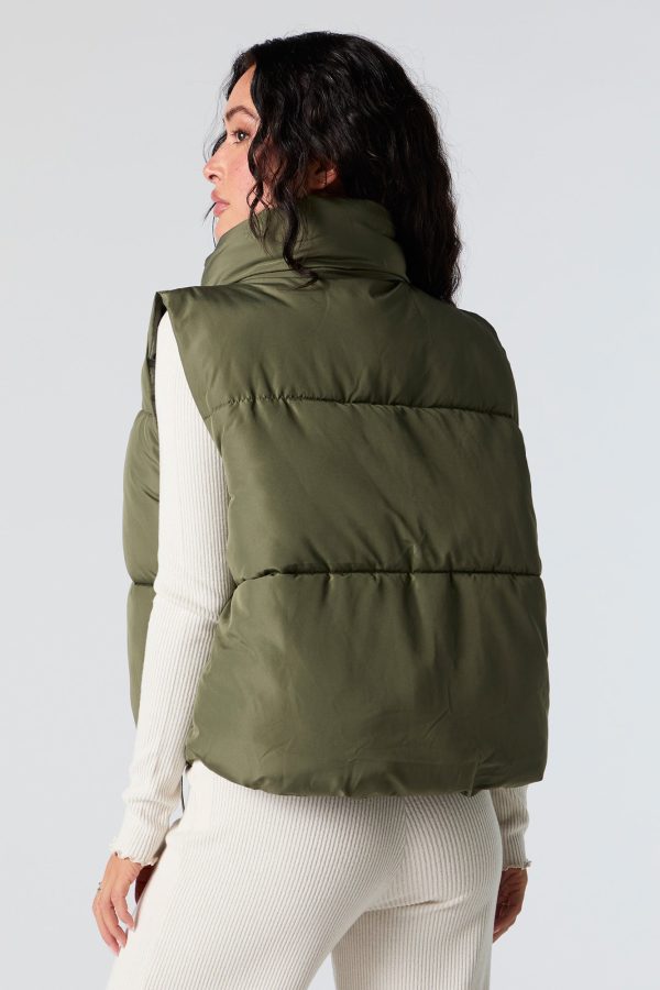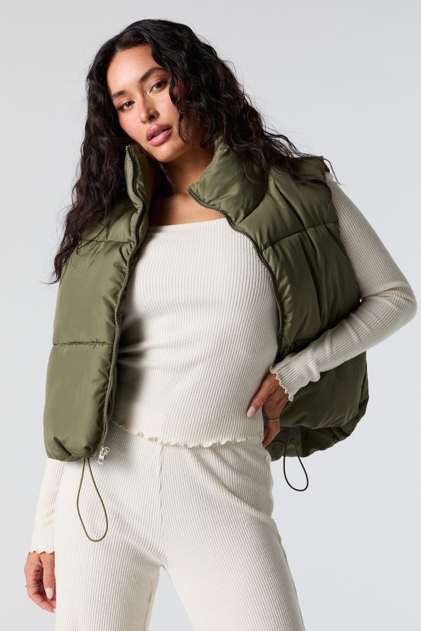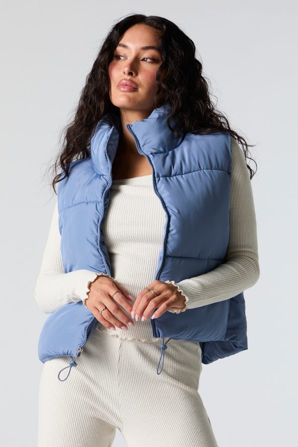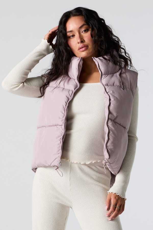 This vest features puffer construction, mock neck, zip-up front, pockets, and toggle hem.