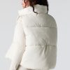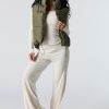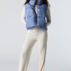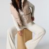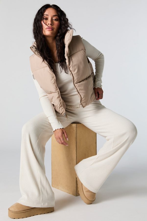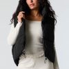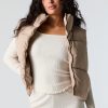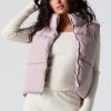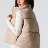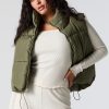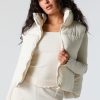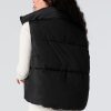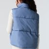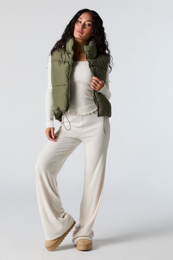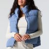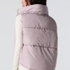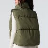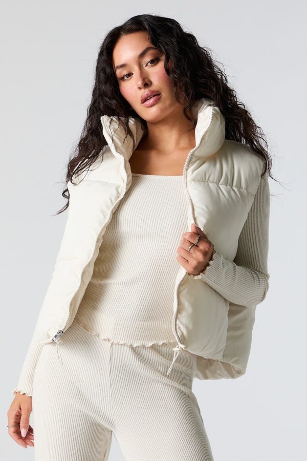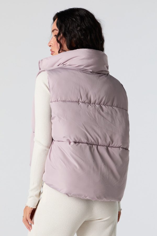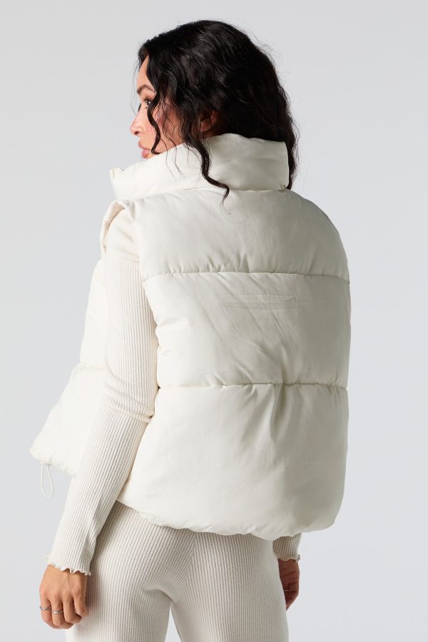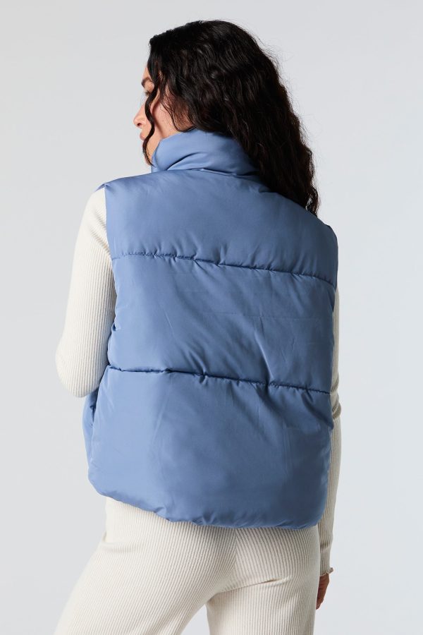 This vest features puffer construction, mock neck, zip-up front, pockets, and toggle hem.